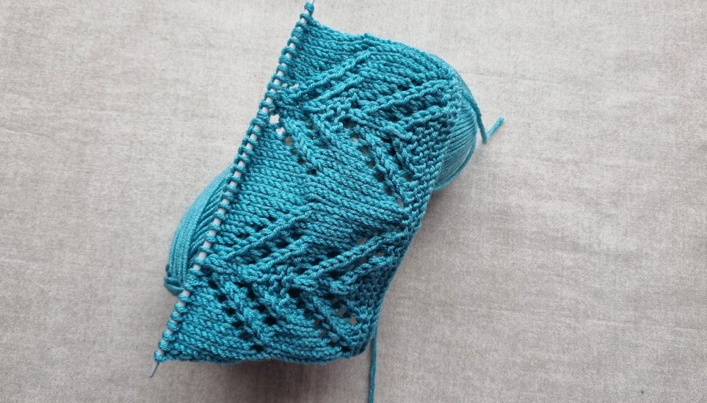 11. Kenar ilmekten sonra 7 ilmek düz örüyoruz. Sonraki ilmekleri 1 dola, sola kesim, 1 düz, sağa kesim, 1 dola ve 5 düz örüyoruz.